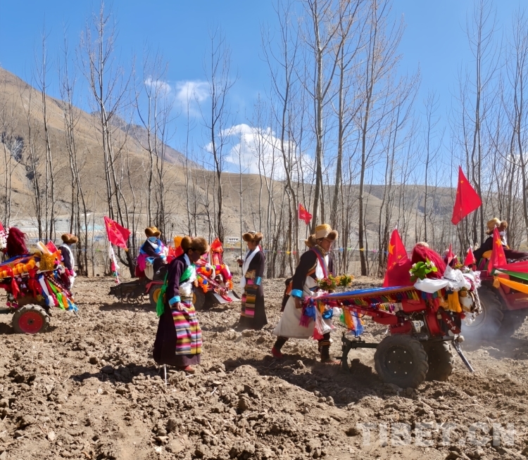 當(dāng)天,村里的男女老少穿上節(jié)日盛裝,手捧哈達(dá),高舉青稞美酒,從村子的各個(gè)角落來到村東頭一塊叫作“聶西滅”的肥沃土地上,男人們駕駛著用彩旗、花束妝點(diǎn)的拖拉機(jī),伴隨著一陣陣轟鳴聲,春耕儀式正式開始。新耕的第一犁,由一個(gè)屬相與今年屬相相符的婦女撒出吉祥、幸運(yùn)的種子,其余的拖拉機(jī)一對(duì)跟著一對(duì)地翻耕,每臺(tái)拖拉機(jī)后面都跟隨著一位盛裝的婦女,她們左手提一桶種子,右手有節(jié)奏地?fù)]擺,翻出沉寂一冬、透著泥土芬芳的肥沃土地,把種子撒入希望的田野。翻耕結(jié)束后,各家各戶把春耕歡慶時(shí)用的青稞酒、卡賽、切瑪?shù)葦[放在供桌上,孩子們?cè)谔镩g喧鬧戲耍,將村民們其樂融融、喜氣洋洋的美好生活景象體現(xiàn)的淋漓盡致。