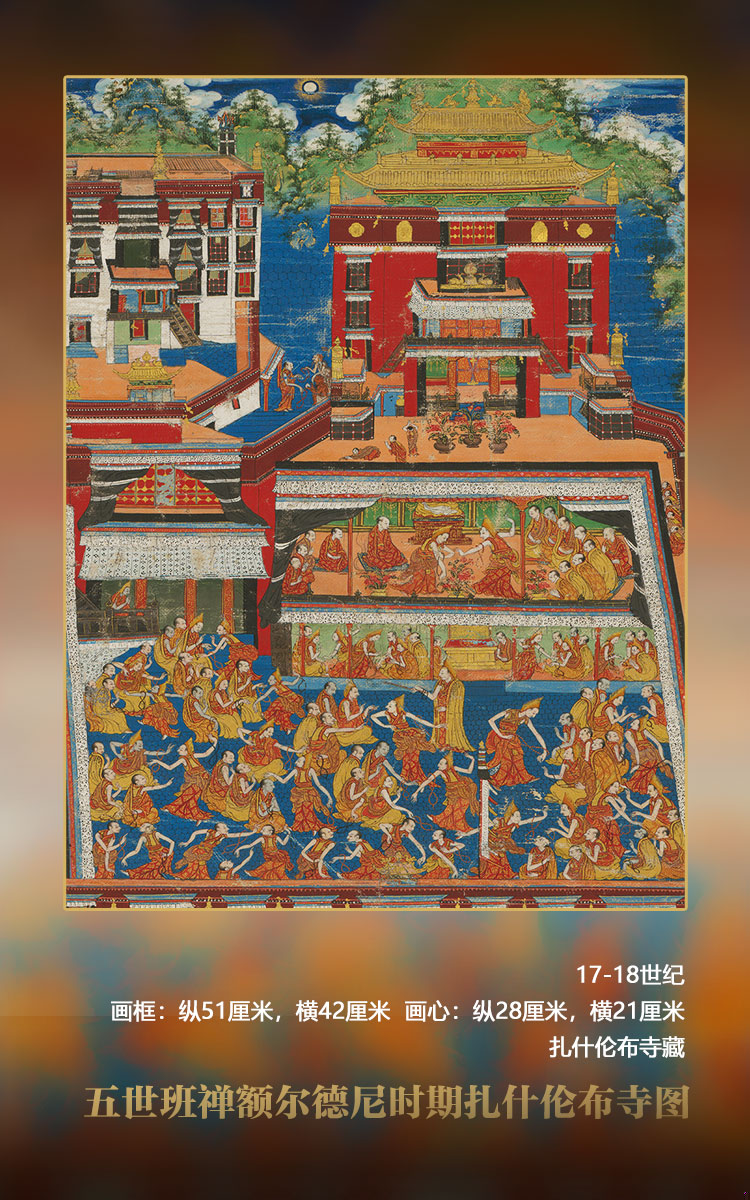 畫面以四世班禪靈塔殿為中心而不及其他,推測(cè)其年代應(yīng)為五世班禪時(shí)期。