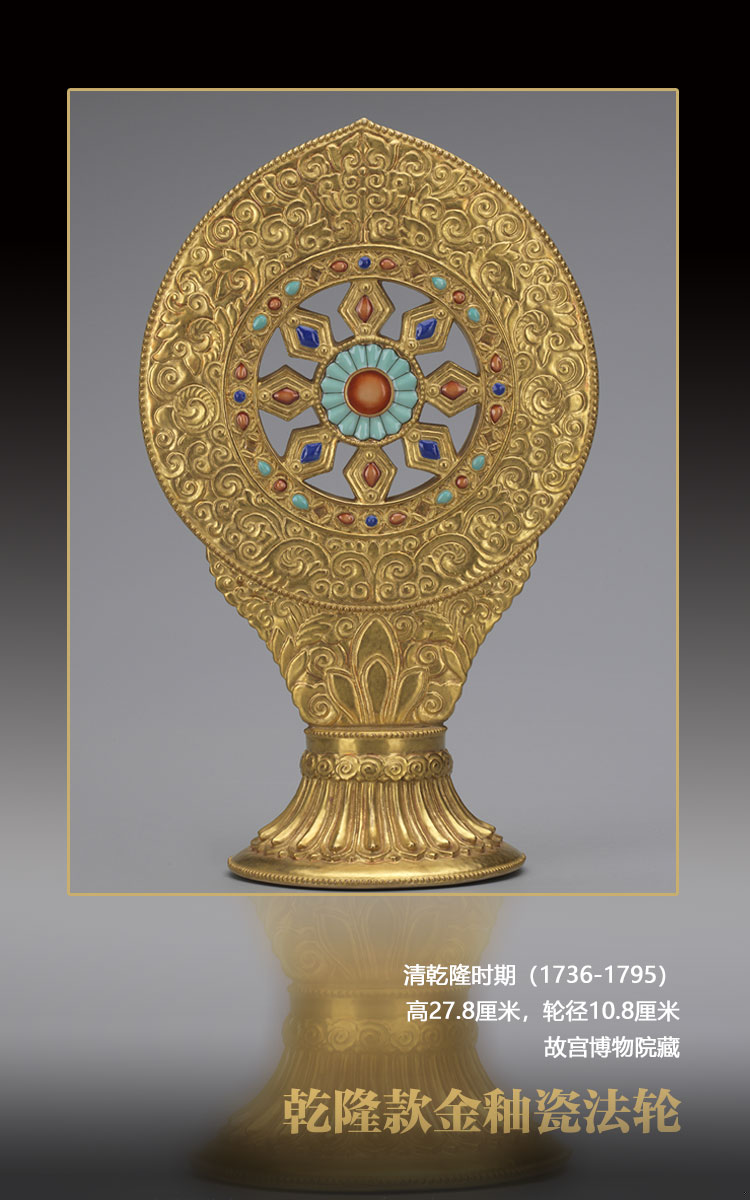 清代皇家崇奉藏傳佛教,乾隆登基后曾命內(nèi)務(wù)府造辦處下屬的景德鎮(zhèn)御窯廠燒制各式瓷質(zhì)佛像與法器備供奉之用。此款金釉瓷法輪仿自當(dāng)時(shí)銅鎏金法輪,為乾隆朝所首創(chuàng),至嘉慶朝仍有制作,只是底款不同,型制并無區(qū)別。這種瓷質(zhì)法輪不僅以金彩仿出銅鍍金效果,還以色彩鮮艷的釉色仿出綠松石、青金石、珊瑚等各種寶石,不得不贊嘆當(dāng)時(shí)工藝的創(chuàng)新與突破。