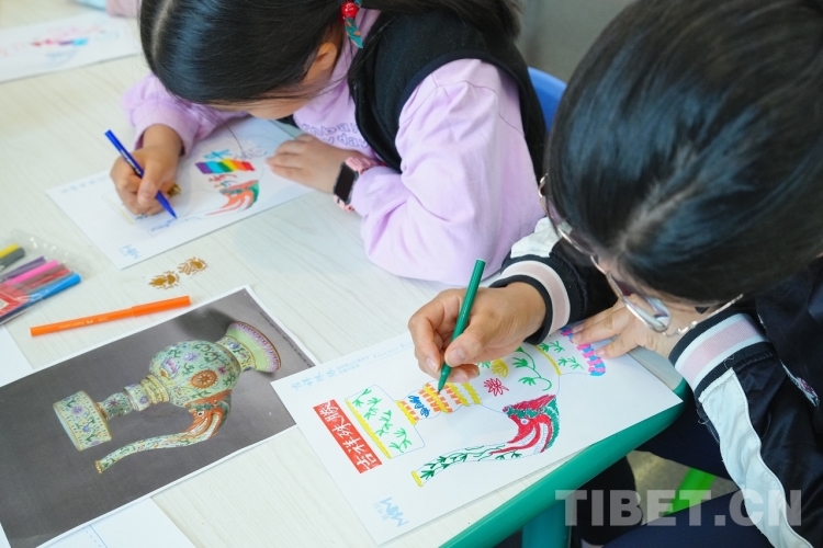 圖為參加“周日親子藝游”活動的學生在畫具有藏族文化特色的奔巴壺(圖片由澳門藝術博物館提供)