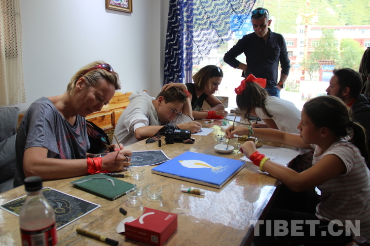 圖為正在爐霍體驗郎卡杰唐卡的外國友人