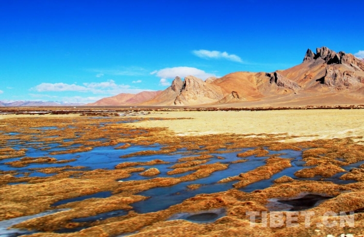 圖為晴朗的天氣里,西藏自治區(qū)阿里地區(qū)日土縣的一處濕地中倒映著蔚藍(lán)的天空 攝影:劉莉