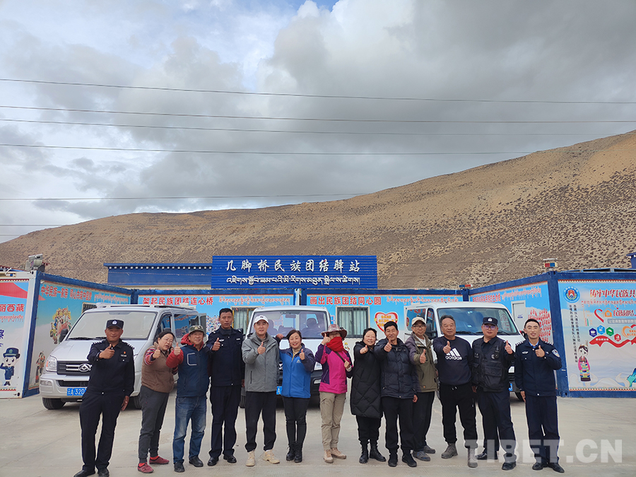 圖為驛站民警和游客在幾腳橋民族團(tuán)結(jié)驛站前合影留念