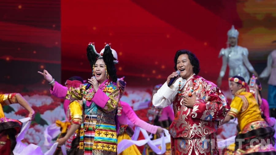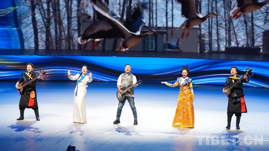 專題演出由開場《祖國萬歲》、上篇《尋夢天湖》、下篇《歡歌拉薩》、尾聲《扎西德勒》四個部分構(gòu)成。通過充分挖掘拉薩的民俗風(fēng)情,將藏族歌舞、傳統(tǒng)說唱藝術(shù)等元素巧妙地融入其中,用視頻展示的自然風(fēng)光、人文景觀作為輔助,優(yōu)化舞臺布局設(shè)計,巧妙布景,為觀眾營造一種身臨其境的感受,共同創(chuàng)造出一個充滿歡樂與感動的氛圍,力圖讓更多的人了解拉薩、愛上拉薩,感受這座城市的獨(dú)特魅力和文化內(nèi)涵。此外,還邀請了容中爾甲、四郎貢布、次仁桑珠、益西卓瑪?shù)妊菟嚱缛耸抗嬷囇莩?,進(jìn)一步豐富和活躍專題演出氛圍。