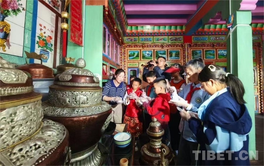 小小石榴籽,殷殷中華情。在“藏家”融情交流中,各地少先隊(duì)員在農(nóng)家一起學(xué)習(xí)制作西藏傳統(tǒng)美食糌粑、卡塞等,一個(gè)個(gè)極具創(chuàng)意造型的“小卡塞”,精致巧妙,隊(duì)員們共學(xué)、共樂(lè)、共享,體悟藏家民族風(fēng)俗,沉浸在歡樂(lè)的氛圍中。來(lái)自重慶市璧山區(qū)劍山實(shí)驗(yàn)小學(xué)五年級(jí)三班的李思穎說(shuō):“參加此次主題隊(duì)會(huì)交流活動(dòng)我非常開(kāi)心,深度體驗(yàn)了‘藏家’民俗,看到祖國(guó)邊疆鄉(xiāng)村的小康生活,豐富的活動(dòng)讓我增強(qiáng)了對(duì)中華民族優(yōu)秀文化的認(rèn)同感和自豪感,我要繼續(xù)爭(zhēng)做小石榴籽,切實(shí)鑄牢中華民族共同體意識(shí)。”