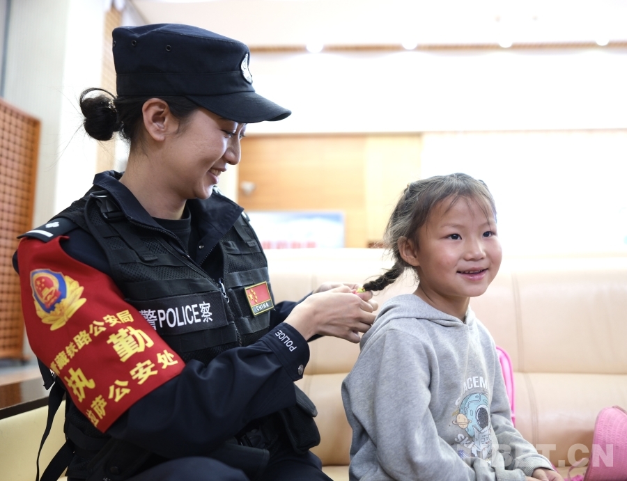 圖為5月31日,馬曉琴在執(zhí)勤時,深受小朋友的喜愛,拉著格桑花辮起頭發(fā),想要跟格?;ㄒ粯屿n麗 攝影:賀瑞明