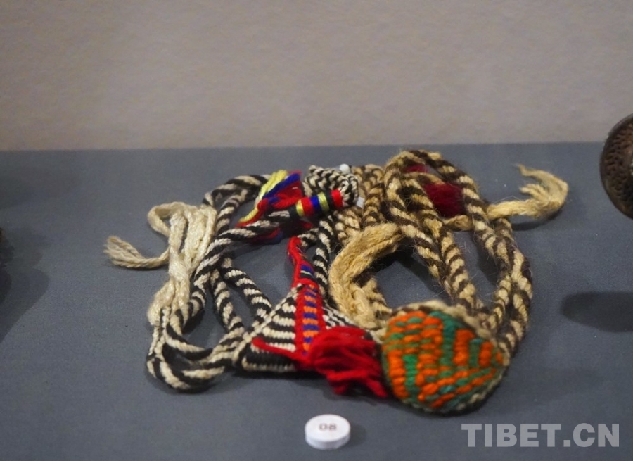 圖為“宗山號(hào)角——紀(jì)念西藏江孜抗英保衛(wèi)戰(zhàn)120周年主題展”展品——烏爾朵,一種牧民放牧牛羊用的皮制工具,可以把拳頭大小的石頭裹起來甩出去,用以驅(qū)趕或圍攏牲畜。攝影:王茜