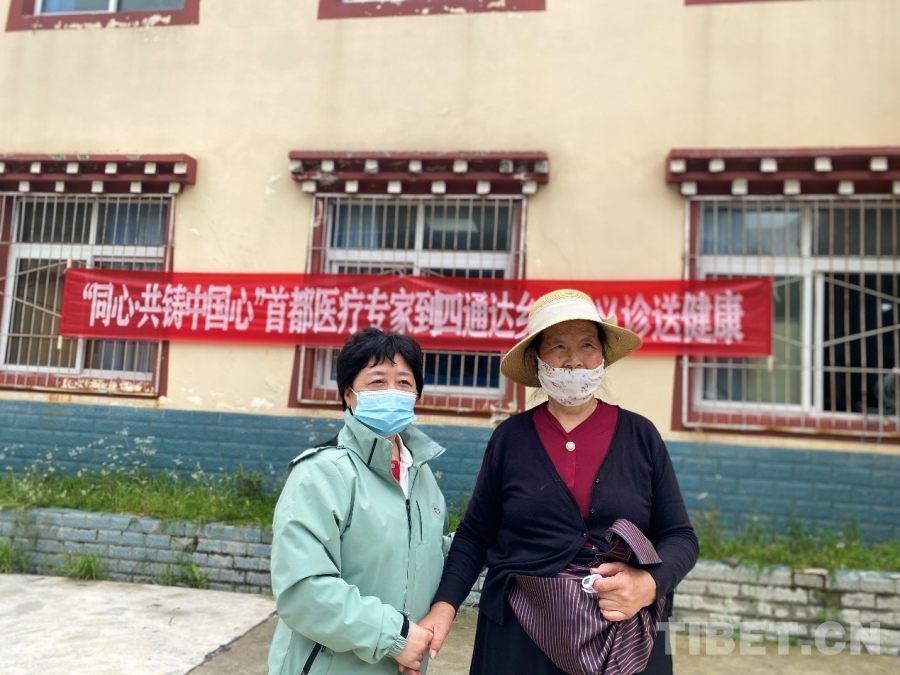 圖為當(dāng)?shù)?1歲村民一手兜著從藥房領(lǐng)取的藥品,另一只手熱情地握住活動(dòng)志愿者航空總醫(yī)院產(chǎn)科武海榮醫(yī)生的手,表達(dá)著她深深的謝意 攝影:格桑