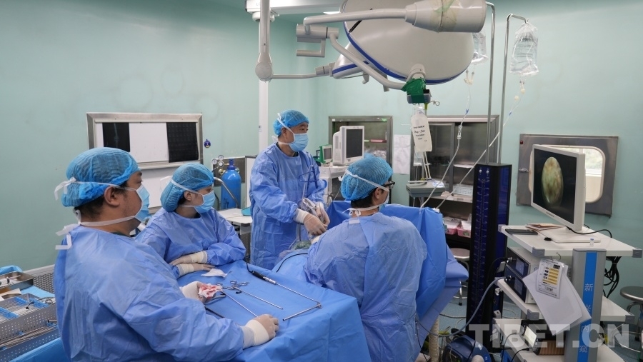 圖為張西峰醫(yī)生(左三)在甘孜藏族自治州人民醫(yī)院為脊柱病變患者做手術(shù) 李錄場(chǎng) 攝