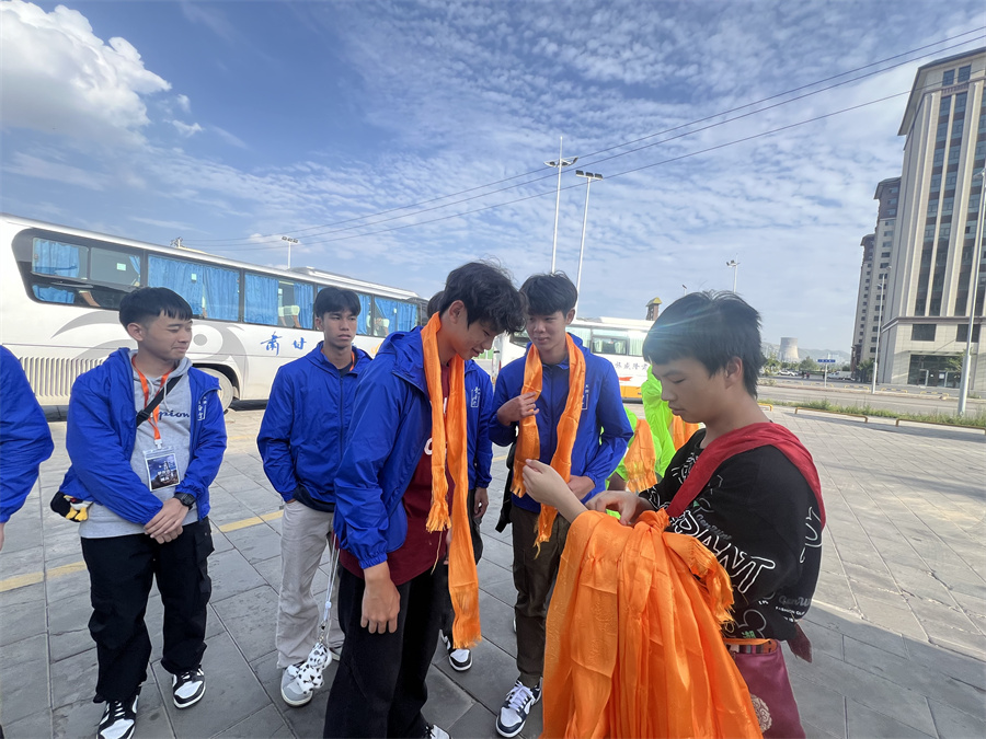 圖為青海當?shù)孛癖娤蛳愀埕缅\秋中學(屯門)學生獻哈達。攝影:李思琦老師