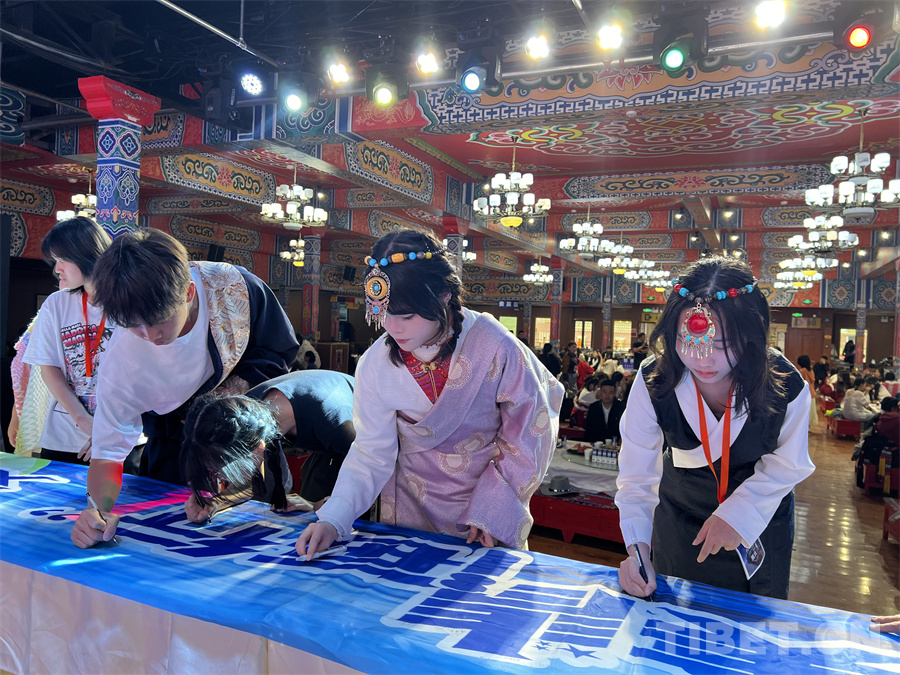 圖為身著藏裝的香港青少年在橫幅上簽字留念。攝影:李思琦老師