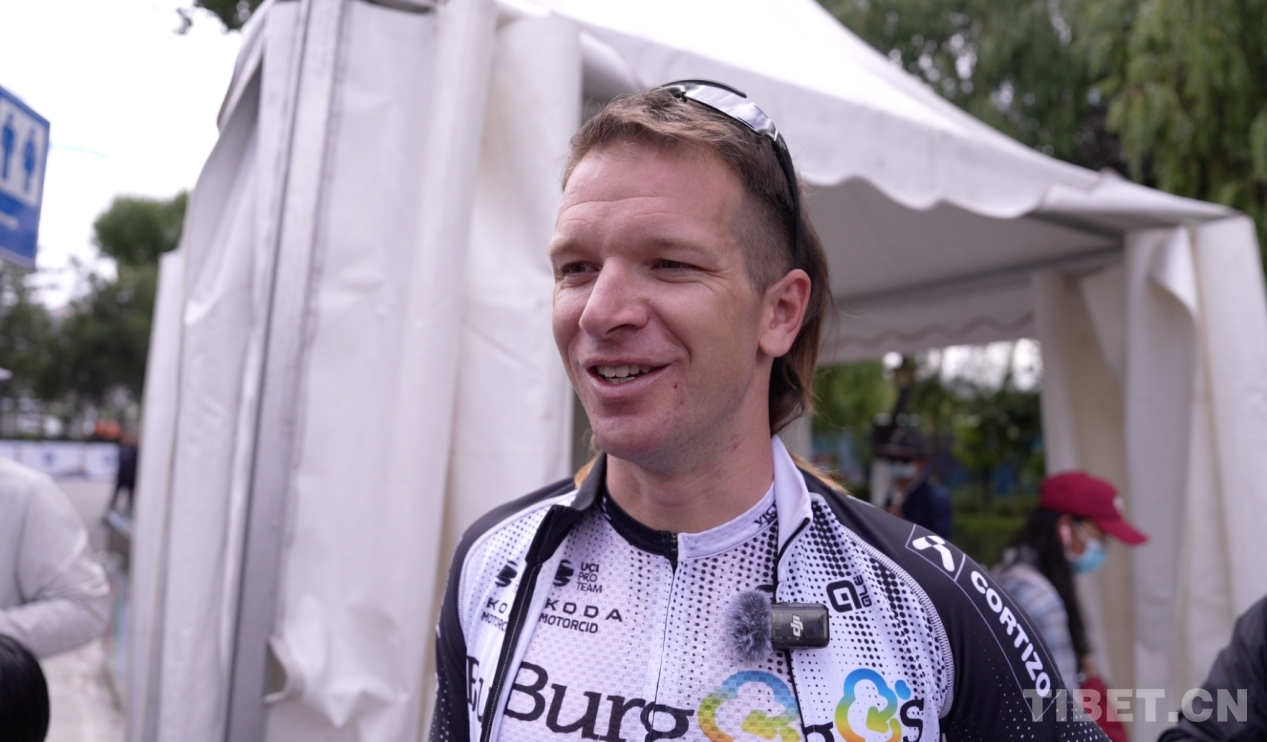 圖為拉薩繞圈賽第二名、來自布爾戈斯·BH職業(yè)隊(duì)的GATE Aaron Murray接受中國西藏網(wǎng)的采訪 攝影:德吉卓瑪