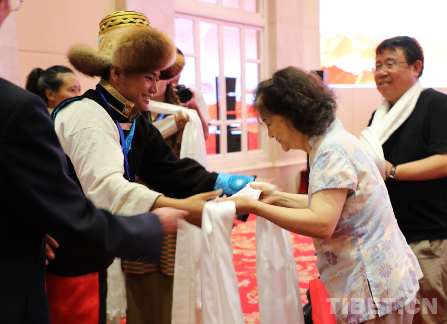 圖為西藏科技專干向北京建藏援藏工作者協(xié)會(huì)會(huì)員獻(xiàn)上哈達(dá) 攝影:王茜