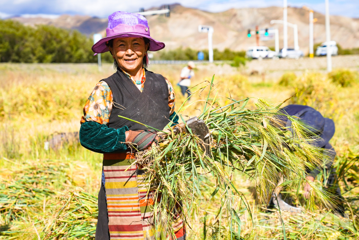 飄香的秋日一片金黃,一臺臺收割機正在青稞田里往來穿梭。2023年,西藏青稞產(chǎn)量達84.36萬噸,播種面積達222.87萬畝,累計建成高標準農(nóng)田430萬畝,青稞良種覆蓋率達到93%,主要糧食作物耕種收綜合機械化率達到71%以上。