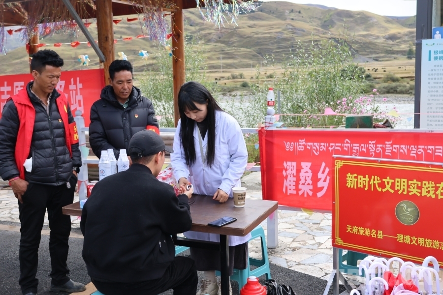 從海拔4700多米的卡子拉山,到一派田園風(fēng)光的濯桑片區(qū);從傳統(tǒng)文化氣息濃厚的勒通古鎮(zhèn),到一望無(wú)際的毛埡大草原,理塘縣共設(shè)立了19處新時(shí)代文明實(shí)踐旅游服務(wù)站,每處站點(diǎn)都配備了至少5名志愿者,從9點(diǎn)到18點(diǎn),全天提供指路問(wèn)詢、文明旅游宣傳、血氧飽和度測(cè)量以及免費(fèi)開水、免費(fèi)雨傘、應(yīng)急充電等志愿服務(wù),并協(xié)助交警開展交通安全宣傳、文明行車引導(dǎo)等工作。