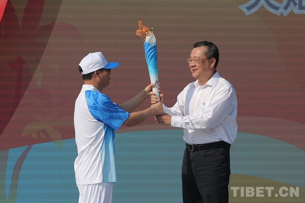 圖為國家民委副主任郭衛(wèi)平(右)將火炬?zhèn)鹘o第一棒火炬手徐洪周 攝影:民族畫報(bào) 滕俊 趙利