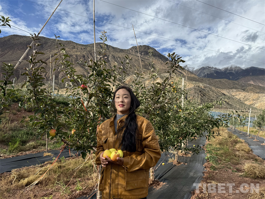 圖為在八宿縣西巴重點經(jīng)濟林基地工作的嘎桑曲珍正在展示手中的維納斯黃金蘋果 攝影:王妍丹