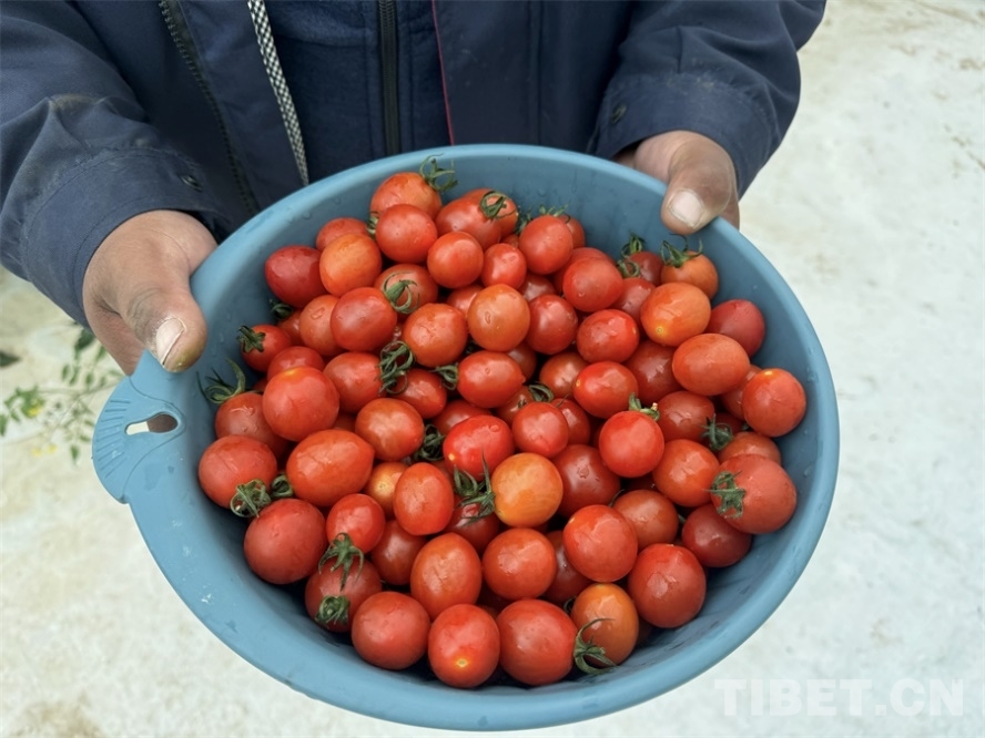 圖為八宿縣白瑪鎮(zhèn)村民正在展示豐收的圣女果 攝影:王妍丹