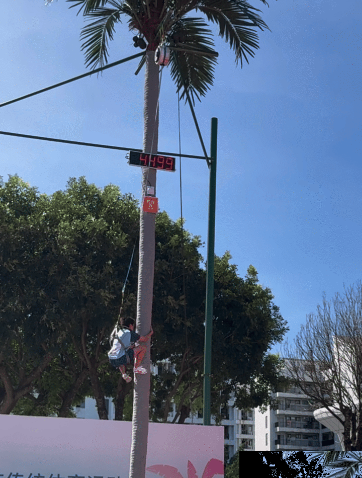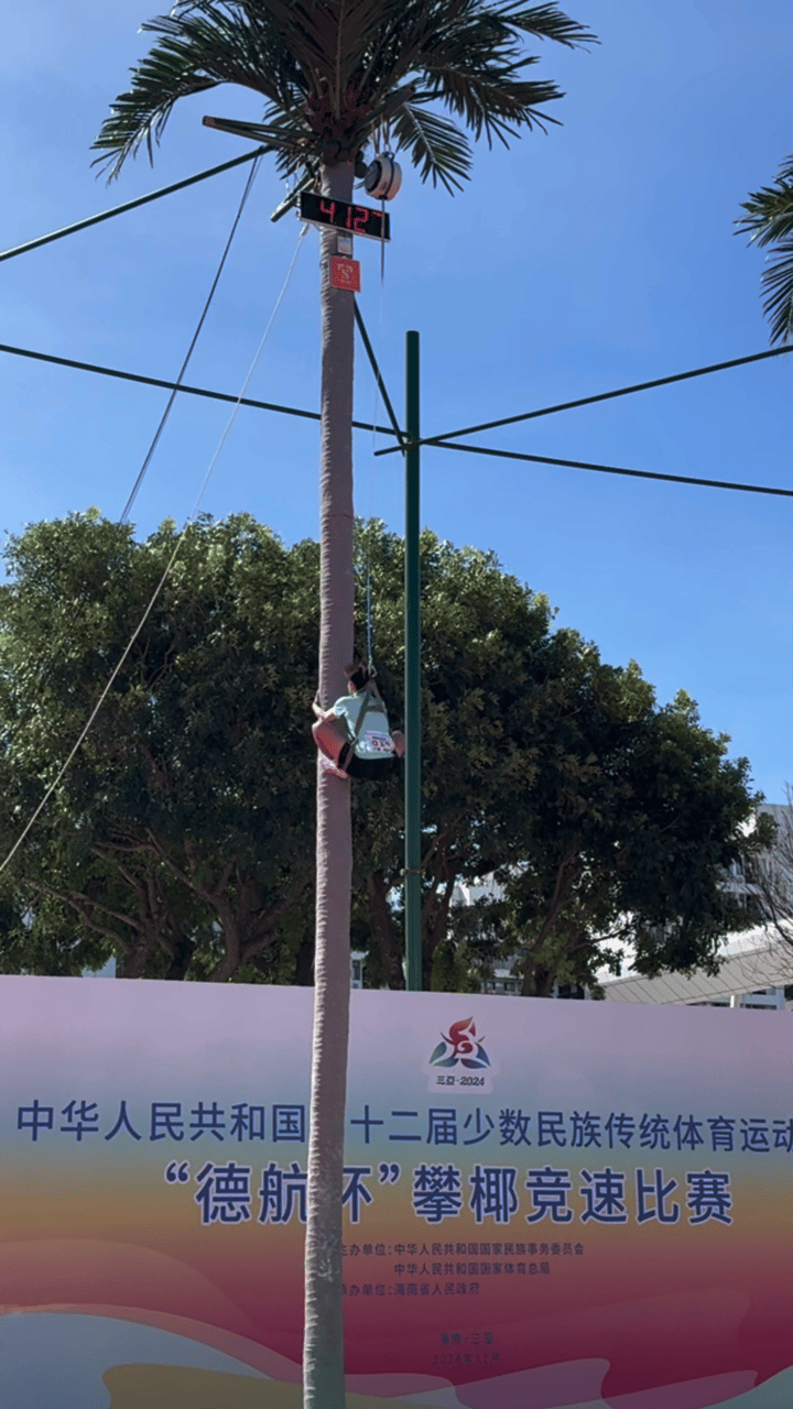 攀椰競(jìng)速設(shè)立男子攀椰9米競(jìng)速和女子攀椰7米競(jìng)速兩個(gè)項(xiàng)目,比賽要求運(yùn)動(dòng)員使用統(tǒng)一提供的攀椰運(yùn)動(dòng)用具,徒手攀爬至椰樹頂部并按下計(jì)時(shí)器,用時(shí)短者獲勝。