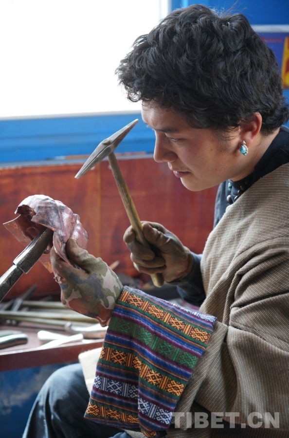 叮叮叮,叮叮?!し欢?,傳來一陣陣金屬敲擊的聲響。掀開門簾,一個(gè)小伙子坐在窗邊,右手拿錘,左手握著佛像架在細(xì)長的鐵器上,右手的錘子不停地敲擊著,左手也在一邊輕微轉(zhuǎn)動(dòng),目光緊緊鎖在眼前的佛像上柔和而堅(jiān)定,古銅色的面龐與紅銅佛像仿佛在進(jìn)行無聲的“對(duì)話”。