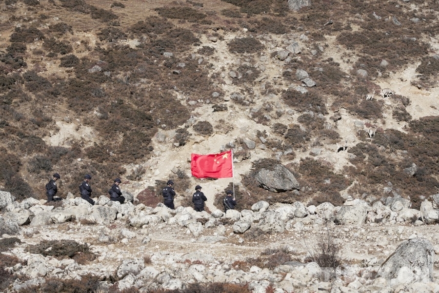 圖為色邊境派出所移民管理警察在巡邏途中與國(guó)家二級(jí)保護(hù)動(dòng)物巖羊“同框” 攝影:郭遠(yuǎn)敬