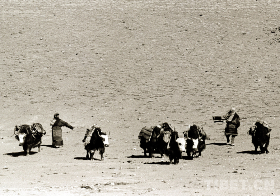 圖為逐水草而居,趕著馱物牦牛正在轉(zhuǎn)移草場的藏北雙湖辦事處(現(xiàn)雙湖縣)的牧民人家(唐召明1987年攝)