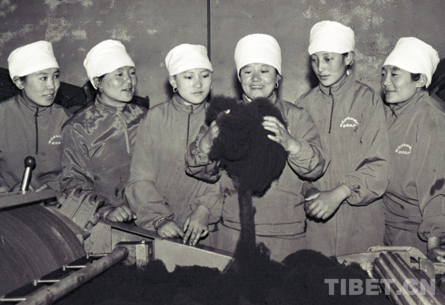 圖為過去手拿牧鞭的牧女格桑措姆(左四)和同伴們在一起分享勞動成果——優(yōu)質(zhì)牦牛絨。她們都是藏北班戈縣絨毛分梳廠的生產(chǎn)能手(唐召明1994年5月2日攝)