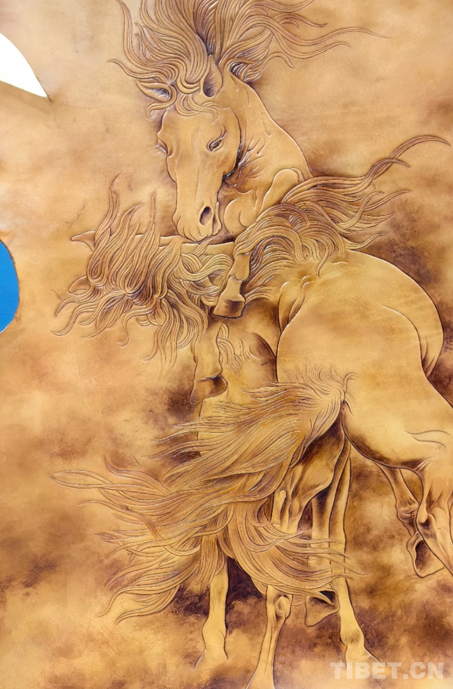 圖為多縣長(zhǎng)江一號(hào)牧場(chǎng)參展的牛皮雕刻畫《青海雙驄》