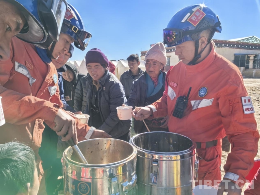 圖為拉薩森林消防大隊(duì)救援人員正在為定日縣曲洛鄉(xiāng)措昂村受災(zāi)群眾分發(fā)熱乎乎的燉菜和饅頭 拉薩森林消防大隊(duì)供圖