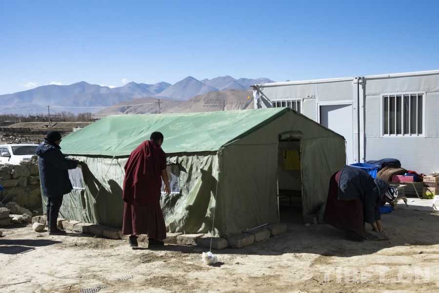 圖為在宗布寺和森嘎曲德寺受災(zāi)僧尼安置點(diǎn)內(nèi)正在搭建的燃燈房 攝影:趙振宇
