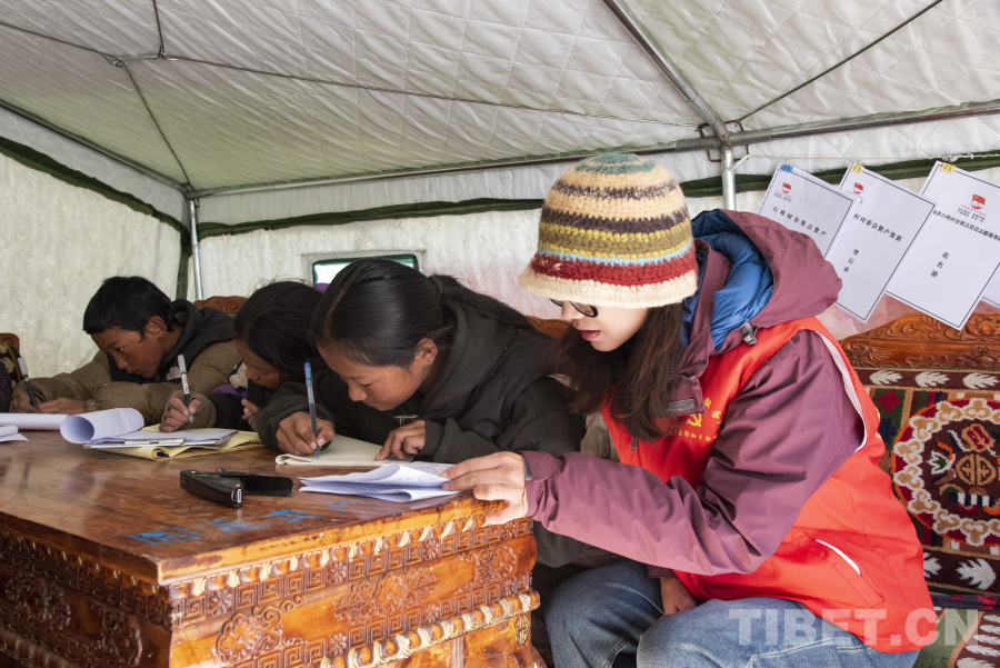 圖為次仁吉巴正在安置點(diǎn)輔導(dǎo)學(xué)生作業(yè) 攝影:趙振宇
