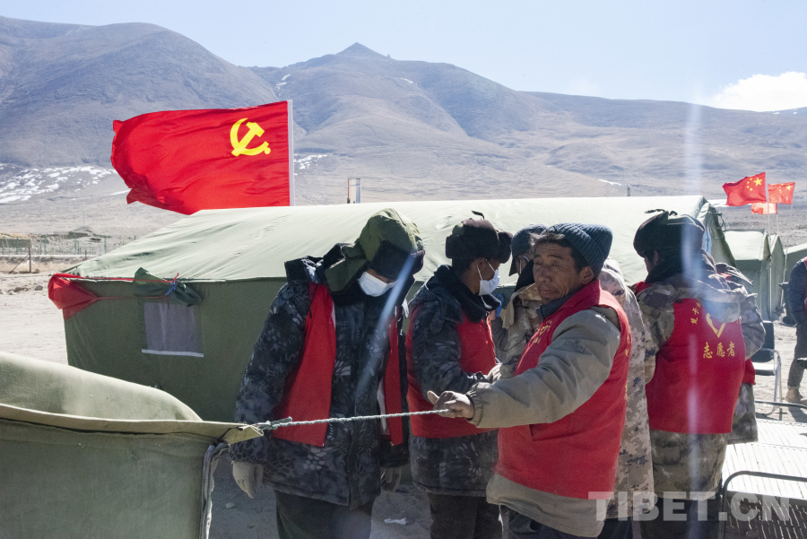 圖為楚卡村黨員志愿者正在為受災(zāi)安置點(diǎn)的帳篷進(jìn)行加固 攝影:趙振宇