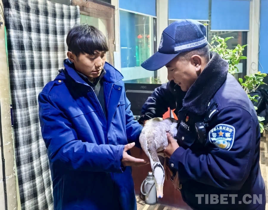 中國西藏網(wǎng)訊 2月16日下午,西藏日喀則仁布縣公安局強欽街便民警務(wù)站民輔警在開展巡邏時,在路邊人行道上發(fā)現(xiàn)一只受傷被困的“大鴨子”,疑似野生保護動物。