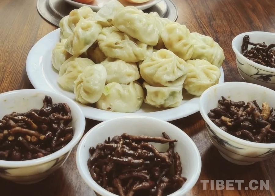 到了中午,我們會邀請鄰里親戚來家里做客,除了準備米飯蔬菜,在牧區(qū),主人家還會煮牛羊的頭來招待客人。大人們都愛吃肉,年輕人都喜歡吃各類蔬菜。到了下午,我們就會吃人參果拌酥油,還有肉包子。