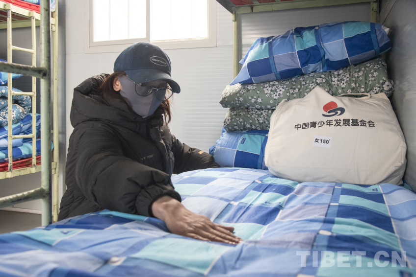 圖為長(zhǎng)所鄉(xiāng)完全小學(xué)教師次旦卓嘎正在學(xué)生板房宿舍內(nèi)為學(xué)生整理床鋪 攝影:趙振宇