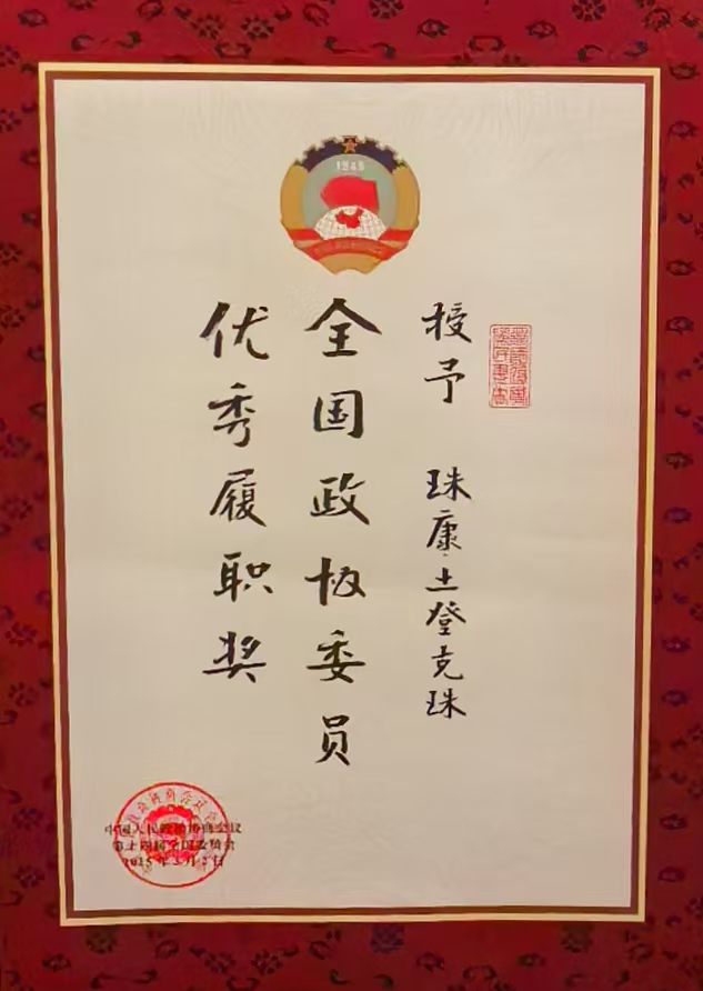圖為珠康·土登克珠榮獲的2024年度“全國(guó)政協(xié)委員優(yōu)秀履職獎(jiǎng)”