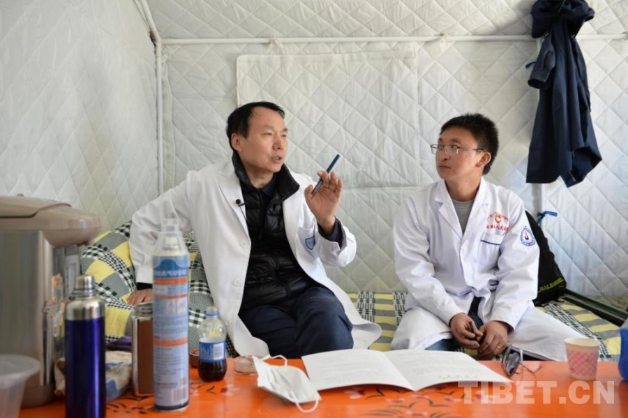 圖為2021年,余震中,王建六(左)帶領(lǐng)團(tuán)隊(duì)赴青海省瑪多縣開(kāi)展宮頸癌篩查,在帳篷辦公室里與當(dāng)?shù)蒯t(yī)務(wù)工作者交流 北京同心共鑄公益基金會(huì)供圖