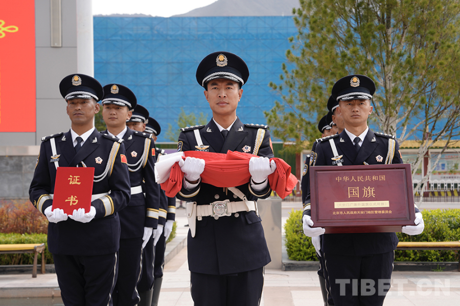 圖為國旗護(hù)衛(wèi)隊護(hù)送國旗至昌都市革命歷史博物館 攝影:群旦次仁