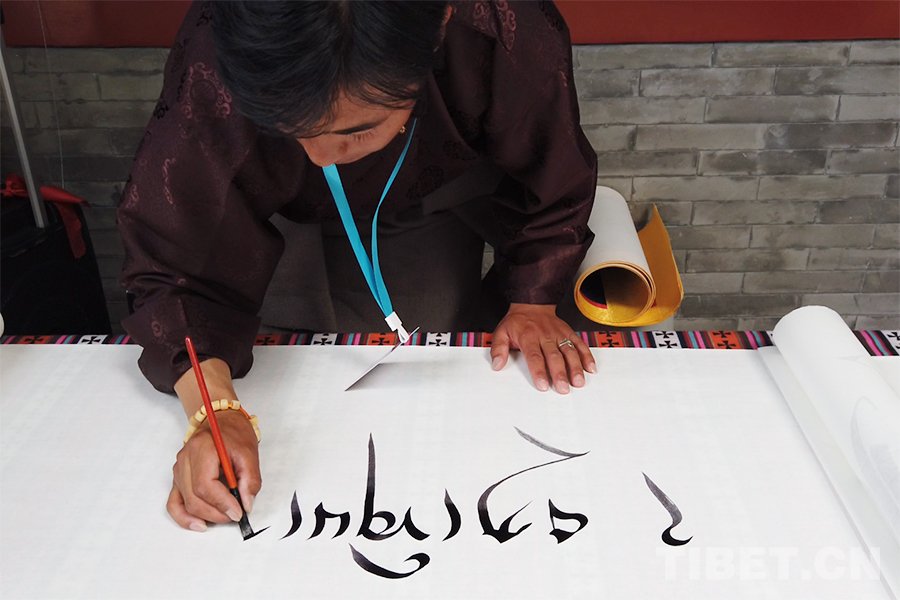圖為那曲市書法家協(xié)會的斯秋平措現(xiàn)場展示藏文書法 攝影:楊月云
