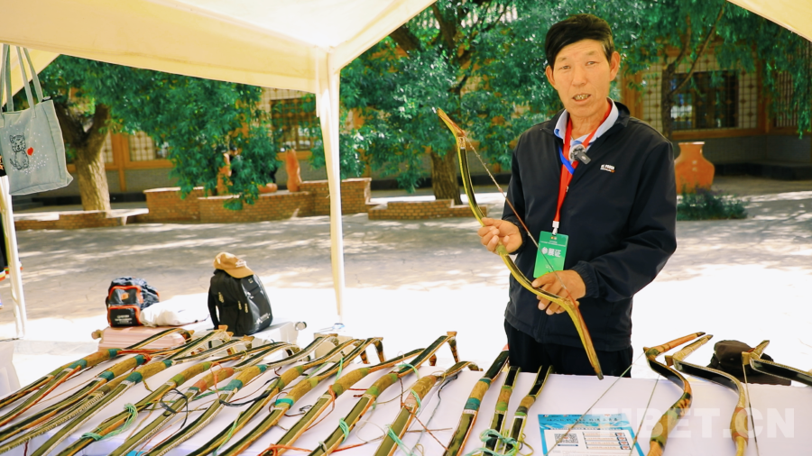 馬國財是一位來自青海省海東市樂都區(qū)的南山傳統牛角弓非遺傳承人,自曾祖父起他家在制作牛角弓方面的技藝是家喻戶曉的。他深受父輩的影響,做弓技藝更是嫻熟。此次活動,他帶來了自己的幾十張得意之作“南山傳統牛角弓”,在現場向對牛角弓感興趣的游客耐心地講解選材、打磨、粘合、鋪筋、扎把、陰干、調試、加牛角、打磨、貼樺皮、上色等弓箭的制作過程,以及在生活當中的實際應用,讓更多的人了解到它不僅僅是一張普通的弓,更是祖祖輩輩的智慧結晶和珍貴非遺。
