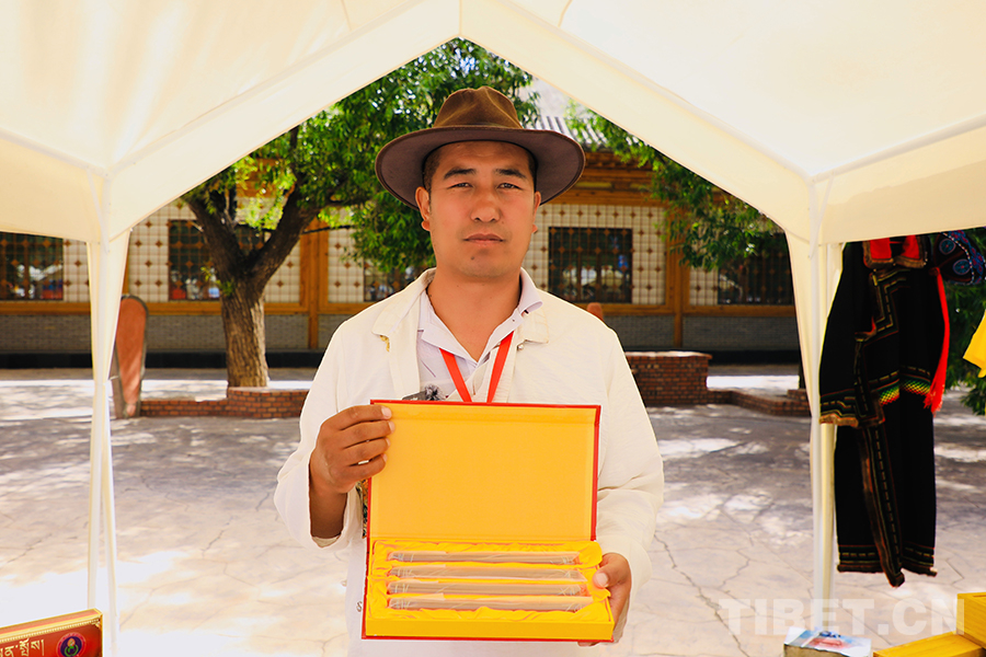 “我今天主要帶來的是我們的工藝產品‘供養(yǎng)藏香’,這些包裝樣式不一的藏香根據規(guī)格大小都有各自的價位,但每一根藏香上付出的心血及所使用的工藝和配料都一致,其中我們也更注重藏香的配料,都是精心篩選的白檀香、藏紅花、安息香、白黑沉香、甘松等二十多種源自高原的天然藥物和香味植物?!碑攩柕侥壳暗匿N售情況時,他坦言道:“今天賣出去的并不是很多,不過今天能和眾多的優(yōu)秀手工藝人同臺參展機會難得,對我來說也是一種學習和展現的契機。”