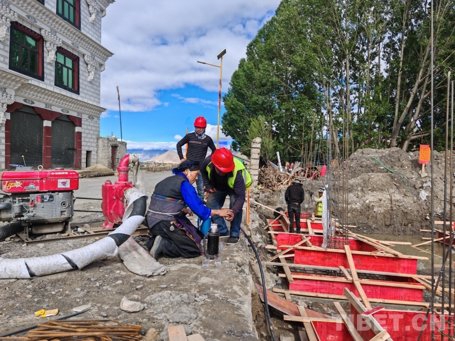 在仲康村巴桑家的重建工地上,工程已進入鋼筋捆扎階段。一場突如其來的夜雨導(dǎo)致基坑積水。清晨七八點,施工隊員已在基坑中忙碌開來,有的加緊捆扎鋼筋,有的尋找水泵抽水。日頭漸高,汗水浸濕了工人們的額頭,他們卻無暇休息。這時,阿媽巴桑提著一壺剛煮好的甜茶走來,就地一杯杯沏好,熱情地招呼這群“小伙子”?!耙郧暗睦戏孔诱饓牧?,現(xiàn)在黨和政府給我們建更好的新房子,日子肯定越過越有盼頭!”樸實的話語里,滿是她對未來的憧憬和對援助的感激。
