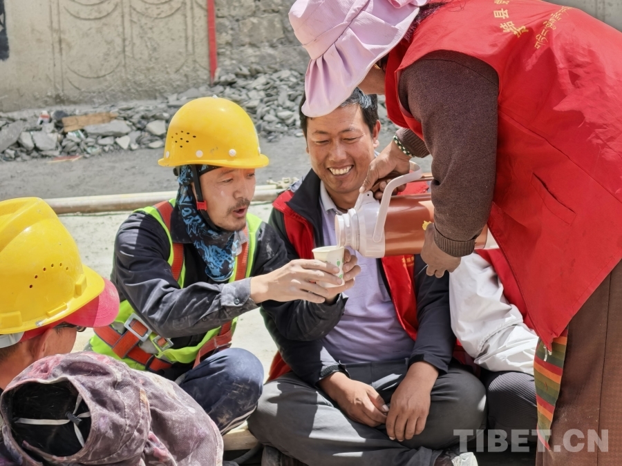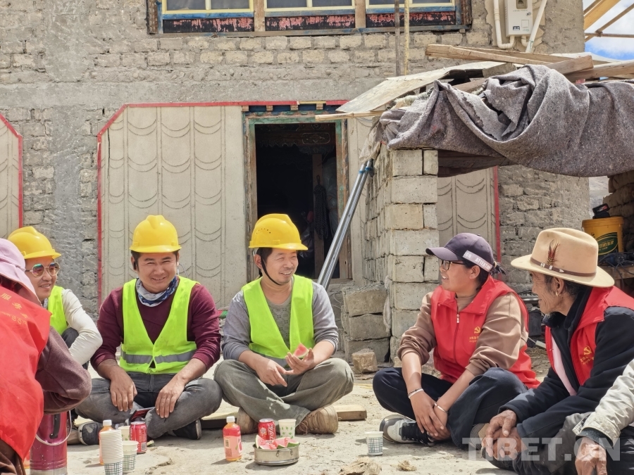 負責(zé)白瑪村重建的四標(biāo)段施工隊,隊員來自五湖四海。來自山西五臺山的建筑工人張計平喝完酥油茶感慨道:“這茶咸中帶甜,干完活喝下去特別解乏提勁!老鄉(xiāng)們太熱情淳樸了,讓我們干活都更有勁兒!”一旁的安全員陳灝吃著西瓜補充道:“我們一定爭取早日讓鄉(xiāng)親們住進安全舒適的新家!”
