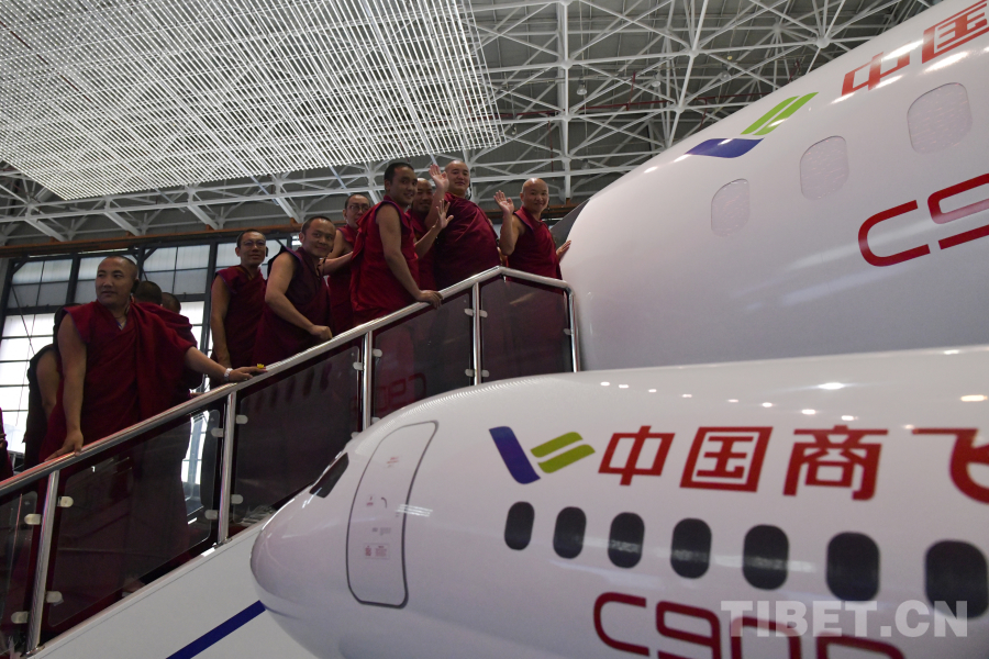 圖為西藏佛學(xué)院師生在中國商飛公司登上國產(chǎn)飛機C909模型機參觀 攝影:趙振宇