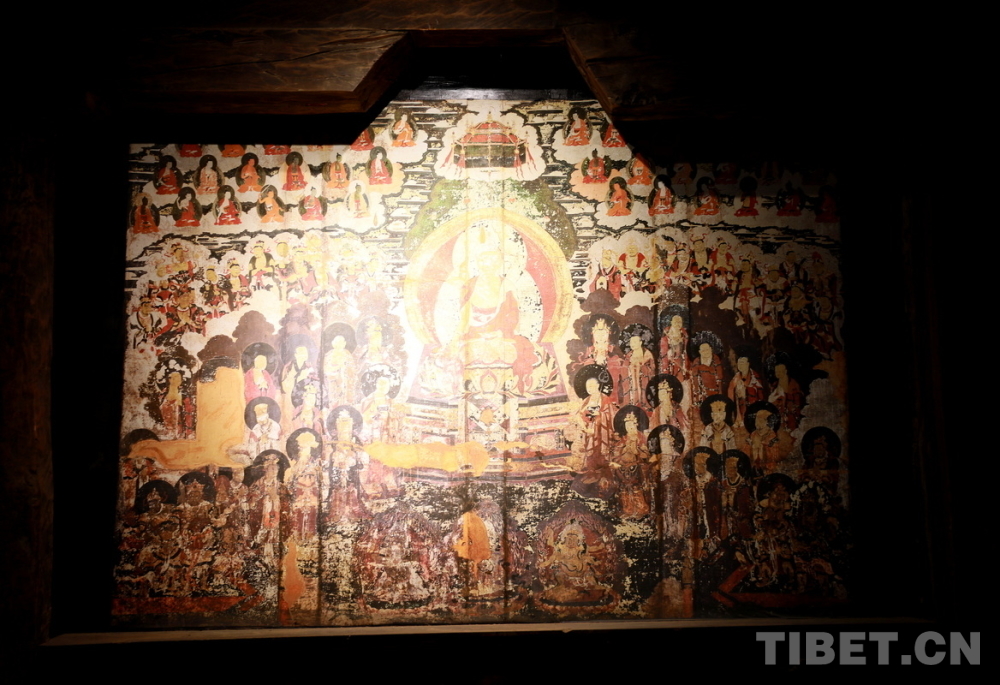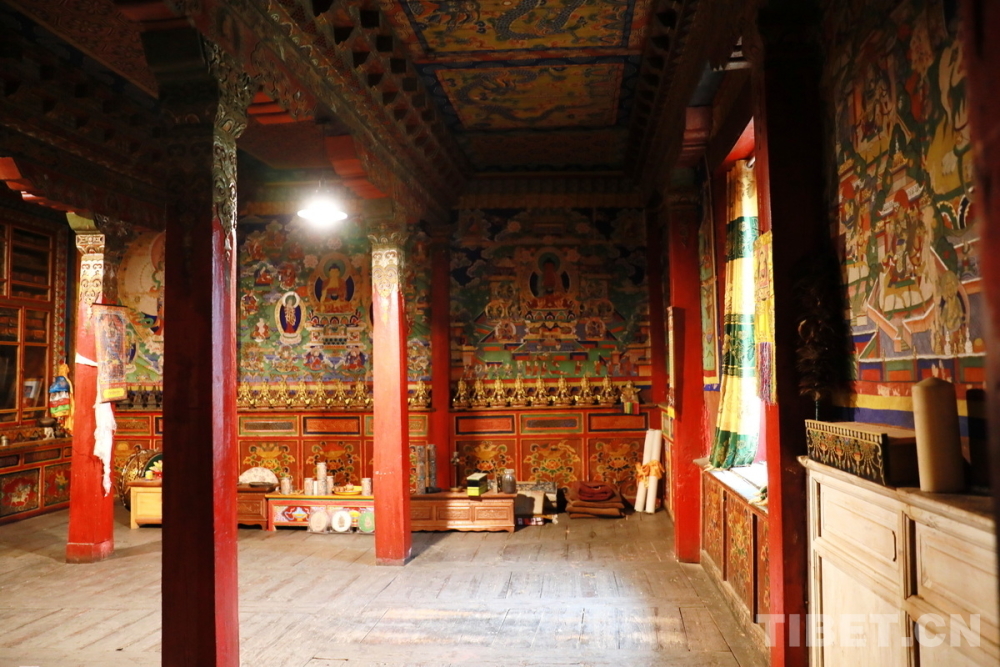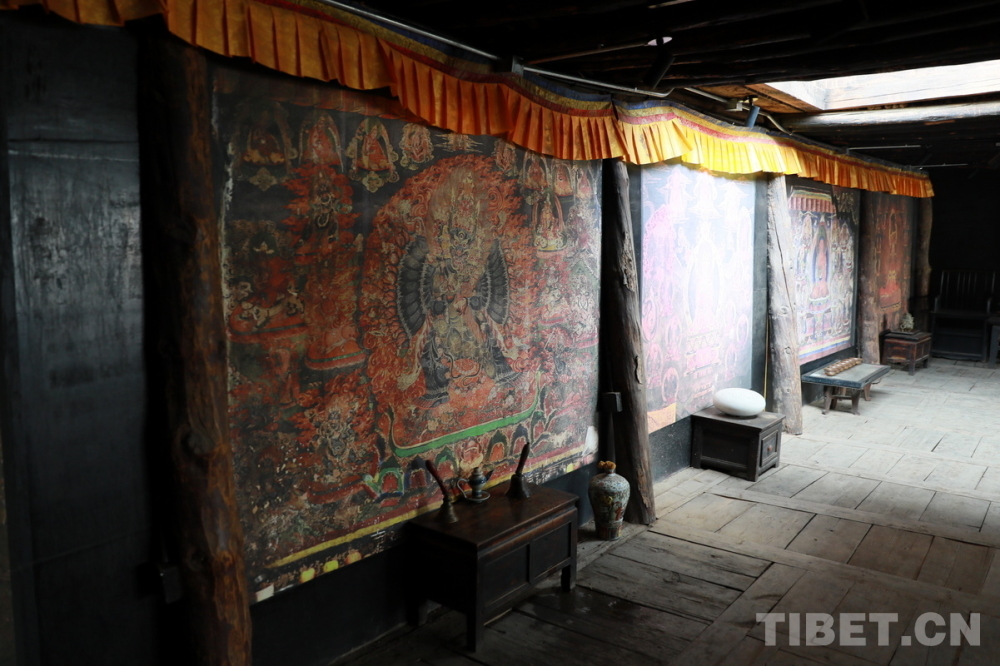 宗薩木府最驚艷的是其經(jīng)堂中歷經(jīng)380余年歷史仍色彩絢麗、保存完整的整堂壁畫。新中國成立后,宗薩木府曾被收歸公有,許多無房的當(dāng)?shù)刎毨罕姳话才抛∵M(jìn)了這里。“文革”時(shí)期,宗薩木府的經(jīng)堂被作為村里的倉庫,人們用報(bào)紙糊住壁畫,使這些藝術(shù)珍品沒有受到“破四舊”的影響。
