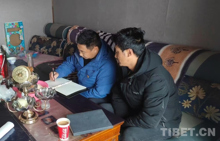 圖為老沙開(kāi)周(左)在當(dāng)曲村管護(hù)員家中了解相關(guān)工作