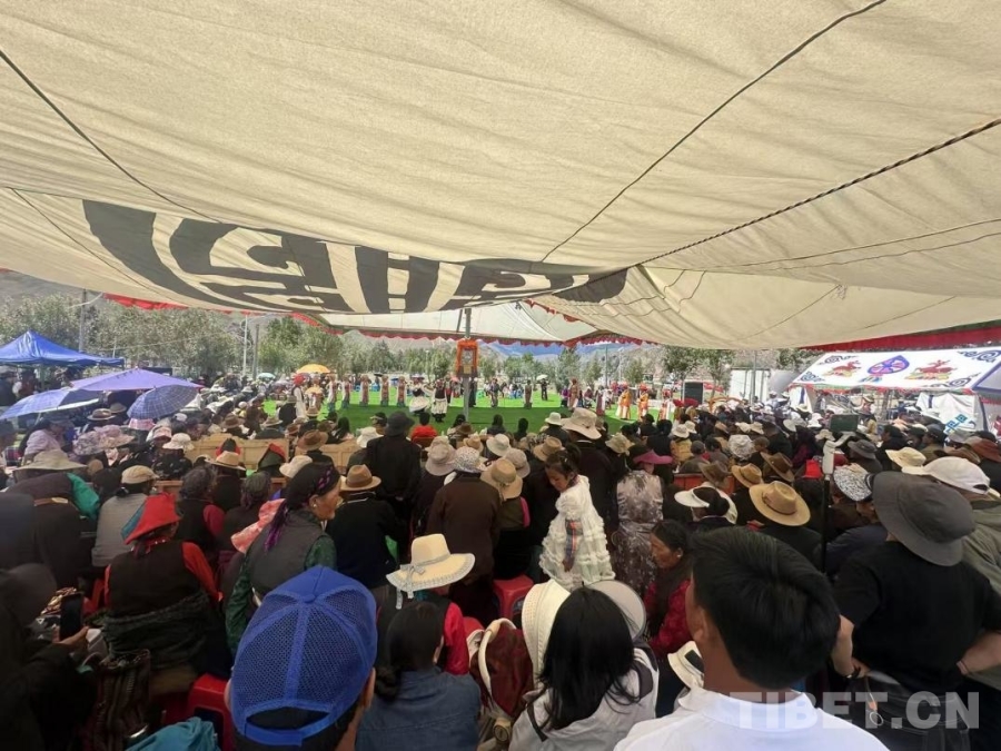圖為日喀則南木林縣非遺林公園內(nèi)的湘巴藏戲展演吸引了大批觀眾駐足觀看