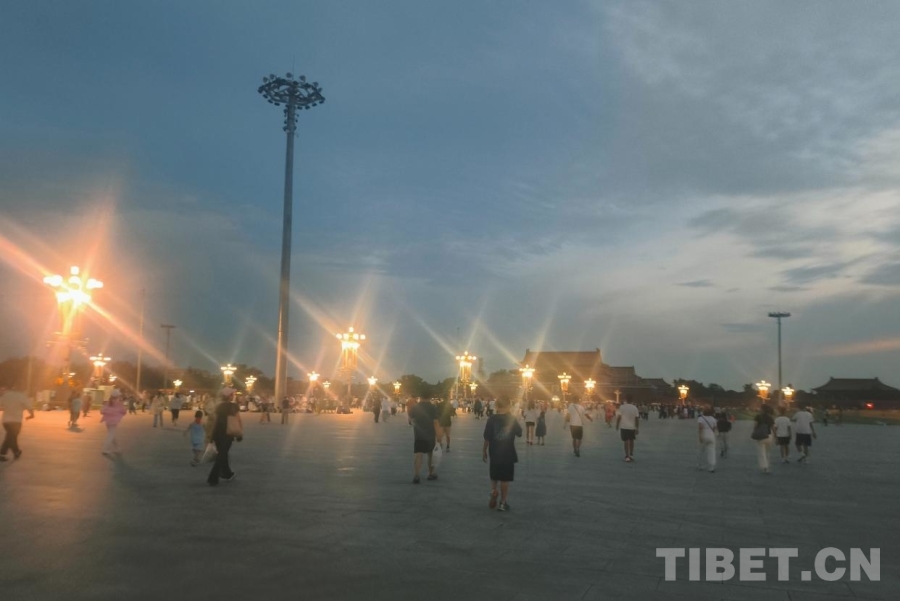 暑期的天安門廣場更加熱鬧,不僅有一家老幼同游的家庭,有旅行社帶來的各地旅游團,最多的是各種學校、團體組織的大大小小的學生團,他們身著不同顏色款式的服裝,共同等待著激動人心的時刻。“山河同脈·京華筑夢”研學團的少年們便是其中一員,他們穿著淺藍色的T恤,戴著白色的棒球帽,散發(fā)著西藏少年的朝氣。