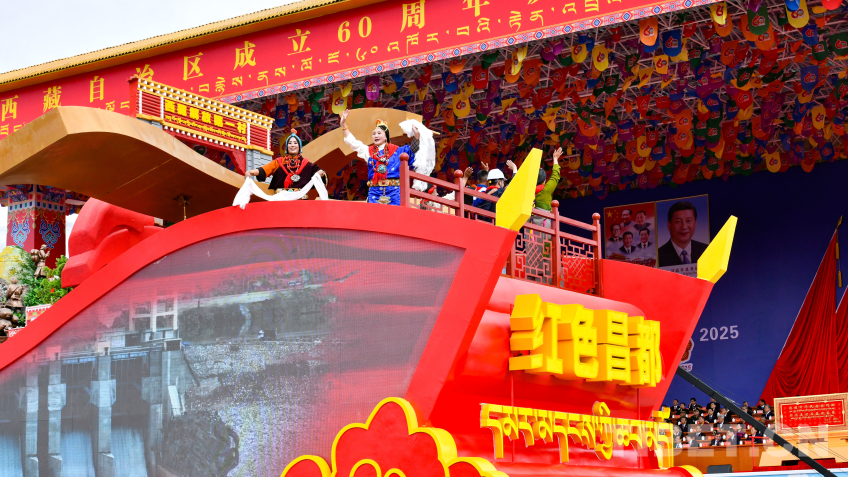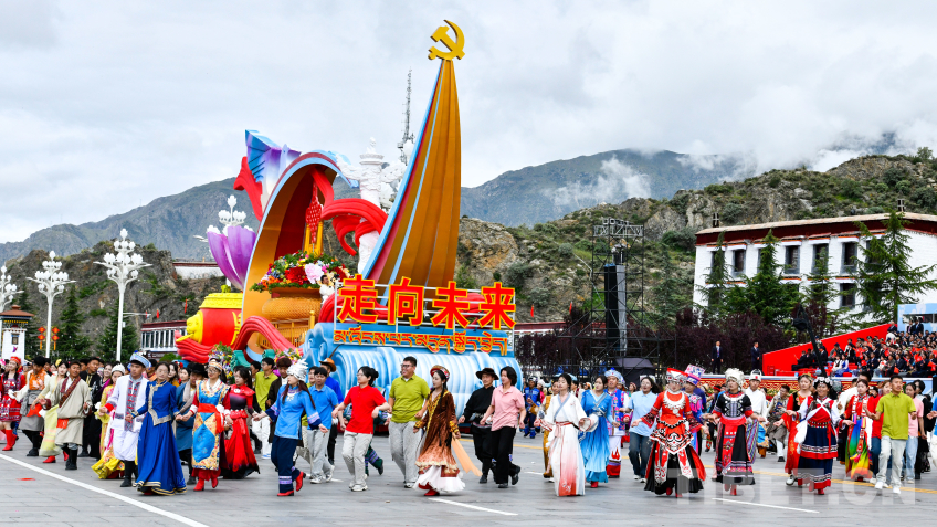 “旗幟引領(lǐng)”彩車,車頭矗立巨型黨旗,八面五星紅旗有序排列其后,展現(xiàn)了在黨中央堅強領(lǐng)導下,西藏各族兒女同心同向、團結(jié)奮進的時代圖景。