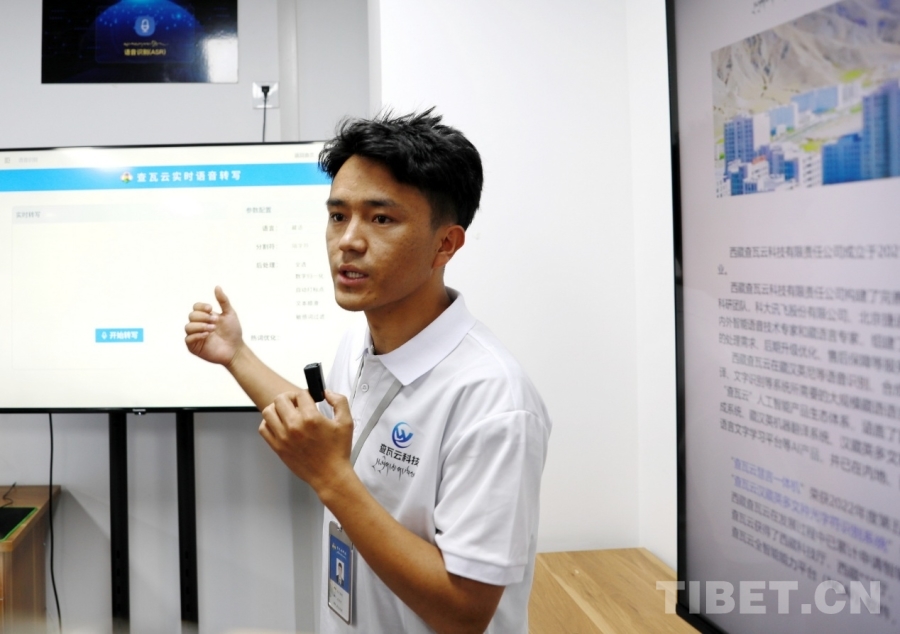 圖為西藏查瓦云科技有限責(zé)任公司副總經(jīng)理次仁桑珠介紹查瓦云實(shí)時(shí)語(yǔ)音轉(zhuǎn)寫(xiě)系統(tǒng) 攝影:劉莉